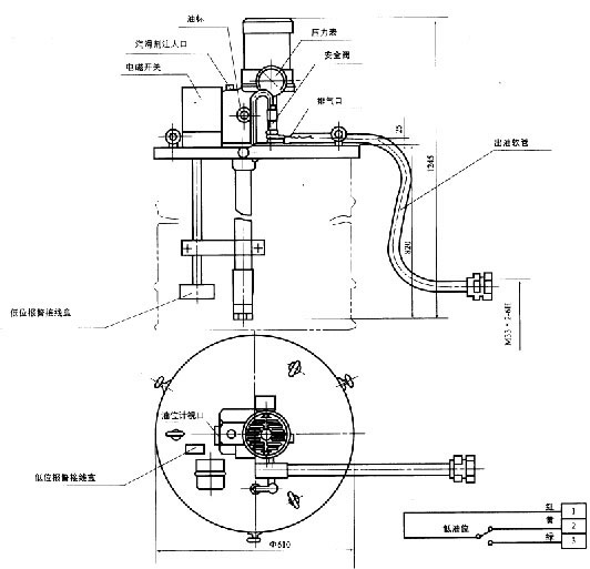 6、本泵設有低位報警裝置,報警后應及時(shí)地向油筒內充填潤滑脂。