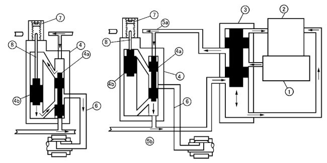 1、潤滑泵;2、貯油器;3、換向閥;4、分配器;4a、先導活塞;4b、主活塞