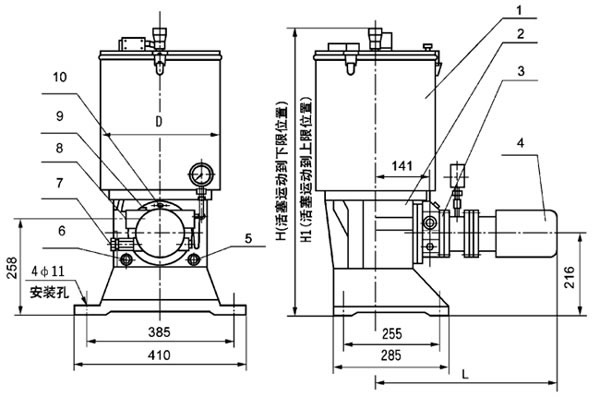 1、貯油筒;2、泵座;3、帶連結法蘭的柱塞泵裝置;4、減速電機5、加油口G3/4;