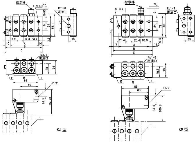 KJ、KM、KL系列單線(xiàn)遞進(jìn)式分配器,它由中碳合金結構鋼制造的供給體、端部體和3~8片根據設計需要所確定的給油量和出油口數的中間體組合而成。分配器的正常出口設置于分配器的兩側面,在上面還設置有預備出口,各中間體的出油口內均裝有止回閥,能徹底防止因潤滑點(diǎn)背壓作用而產(chǎn)生潤滑脂的逆流,保證了各出油口的給油量定量、準確。