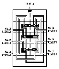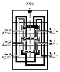 5、流入的潤滑劑推動(dòng)活塞C向右移動(dòng)、右腔的潤滑劑壓向NO.4吐出口經(jīng)外部配管送向潤滑點(diǎn)。當活塞C運動(dòng)至右極限時(shí)活塞B左腔開(kāi)始進(jìn)入潤滑劑。