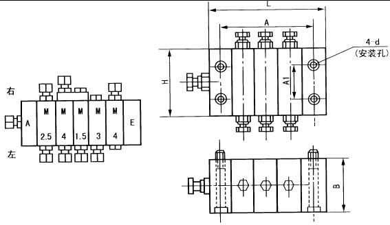說(shuō)明:遞進(jìn)分配器的組合按進(jìn)油口元件首塊A、工作塊M和尾塊E、從左到右排列,在隊列下方出口稱(chēng)為左,在隊列上方出口稱(chēng)為右。如圖
